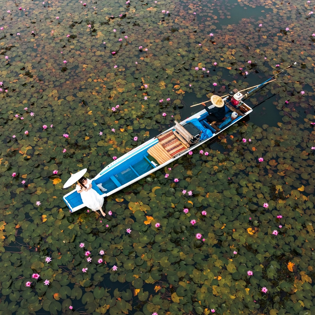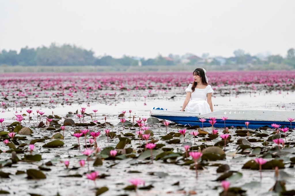 เมื่อเรือแล่นผ่านผืนน้ำกว้าง คุณจะได้เห็นดอกบัวแดงบานสะพรั่งทั่วท้องน้ำ สวยจนต้องหยิบกล้องขึ้นมาถ่ายแบบไม่หยุดมือ ไม่ว่าจะเป็นภาพระยะไกลแบบพาโนรามา หรือมุมใกล้ที่เห็นกลีบสีชมพูชัดเต็มตาก็งดงามไม่แพ้กัน