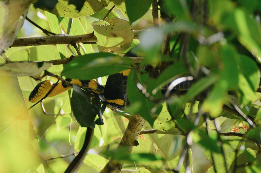 งูหายาก เช่น งูเหลือมและงูปล้องทอง ที่แอบซ่อนตัวอยู่ตามกิ่งไม้ (ไม่ต้องกลัวค่ะ ไกด์จะดูแลอย่างดี)