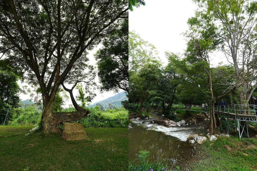 🌳 ต้นจามจุรีและสะพานไม้ข้ามธารน้ำ