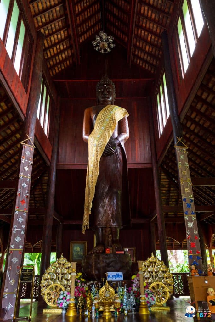 ภายในประดิษฐานพระพุทธรูปไม้ปางจงกรมแก้ว ความสูงถึง 9 เมตร แกะสลักจากต้นไม้ใหญ่เพียงต้นเดียว ถือเป็นงานศิลป์ทางศาสนาที่หาชมได้ยากยิ่ง ✨