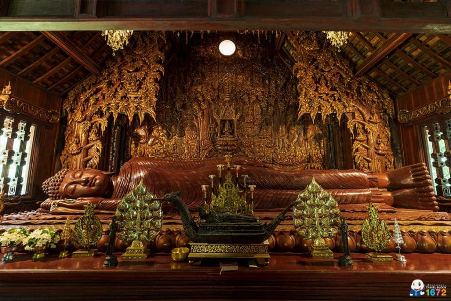 ประดิษฐานพระพุทธรูปไม้แกะสลักปางปรินิพพาน รายล้อมด้วยงานแกะสลักไม้ที่สะท้อนภูมิปัญญาช่างพื้นบ้านล้านนาอย่างลึกซึ้ง 🌸