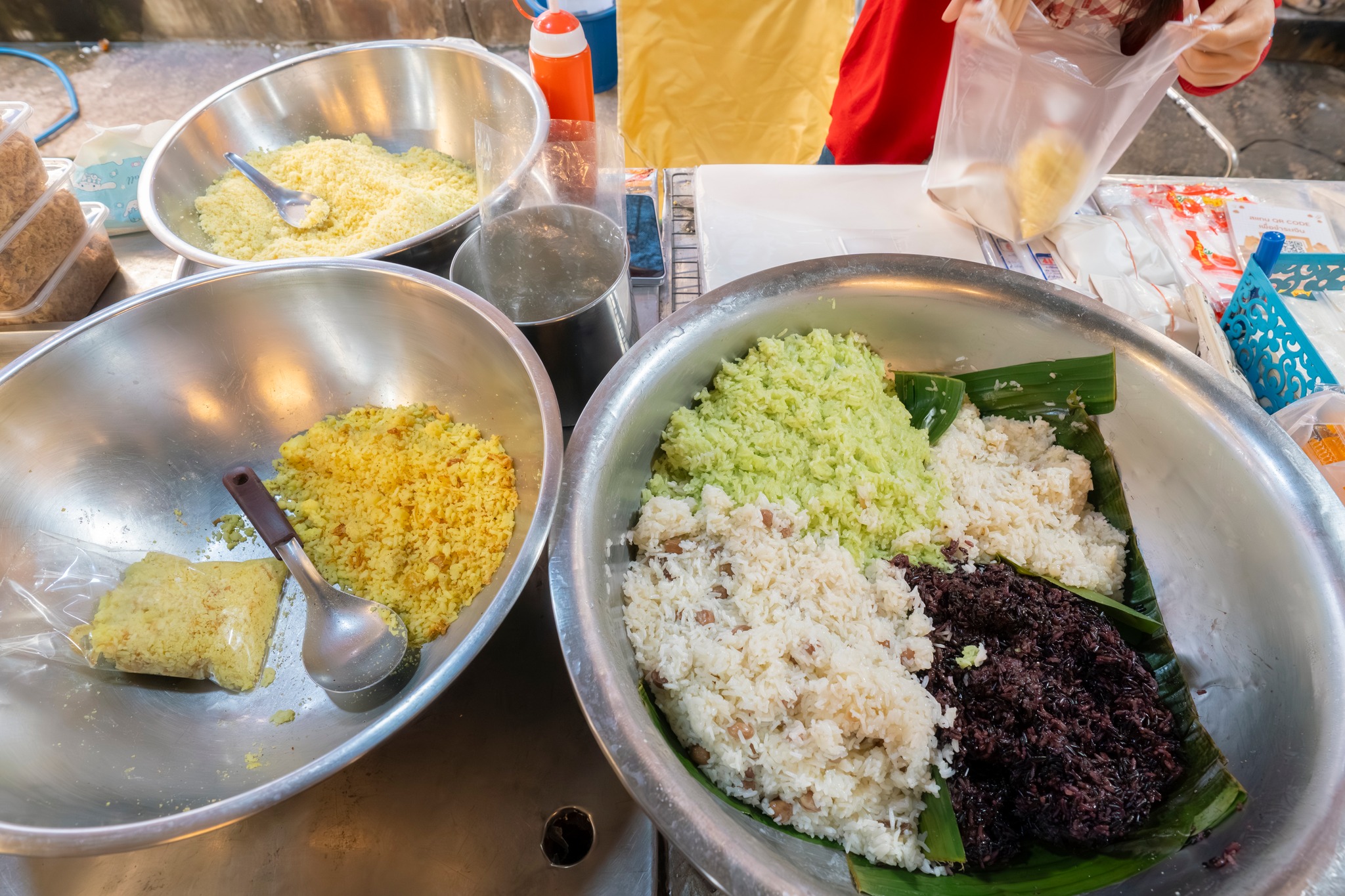 เดินลัดเลาะไปตามทางเดินแคบ ๆ ของตลาด สายตาก็พลางมองหาป้ายร้านหรือถาดข้าวเหนียวสีสวยที่เล่าลือกันว่าเหลือขายเพียงเจ้าเดียวในจังหวัด จนเกือบถึงทางออกตลาด สายตาสะดุดเข้ากับร้านขนมไทยเล็ก ๆ แห่งหนึ่ง ข้าวเหนียวนึ่งหลากสีถูกจัดวางอย่างงดงามบนใบตองในอ่างใบใหญ่