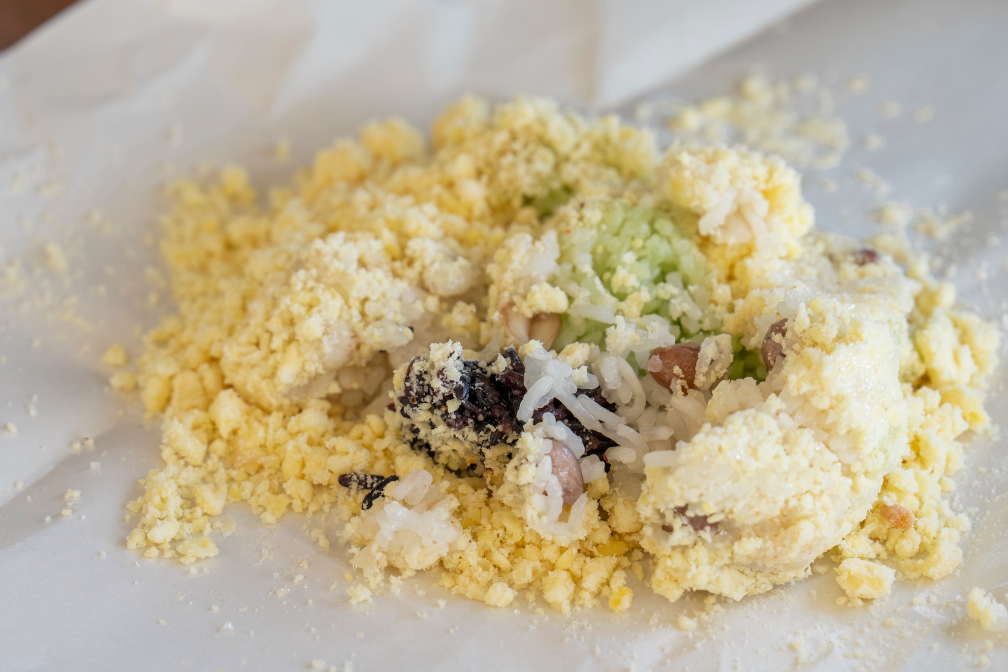 เมื่อถึงเวลาชิม เราแกะห่อกระดาษออกอย่างทะนุถนอม โรยถั่วเขียวนึ่งบนข้าวเหนียว ตามด้วยน้ำตาลและงา กลิ่นหอมของงาคั่วลอยขึ้นทันที รสชาติหวานนุ่มละมุน ได้ความมันจากธัญพืชหลากชนิด เคี้ยวไปแต่ละคำให้ความรู้สึกอบอุ่นเหมือนอาหารที่แม่ทำให้กินในวัยเด็ก 🥥🌾