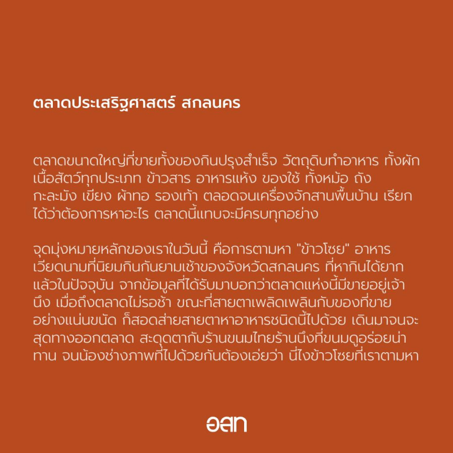 เลาะหาแนวกิน ถิ่นสกลนคร 🌾🍚 ตลาดเช้าใจกลางเมืองกับ “ข้าวโซย” รสละมุนที่เหลือเพียงร้านเดียว เช้าวันหนึ่งในตัวเมืองของจังหวัด สกลนคร อากาศยังคงเย็นสบาย ละอองแดดอ่อนๆ ค่อย ๆ ไล้ผ่านหลังคาตึกเก่าและแผงค้าไม้เรียงราย เสียงพ่อค้าแม่ค้าทักทายลูกค้าดังคลอไปกับกลิ่นหอมของข้าวเหนียวนึ่งและอาหารพื้นถิ่นที่เพิ่งยกลงจากเตา บรรยากาศแบบนี้เองที่ทำให้ “การตื่นเช้า” กลายเป็นความสุขเล็ก ๆ ของนักเดินทาง 🌤️✨