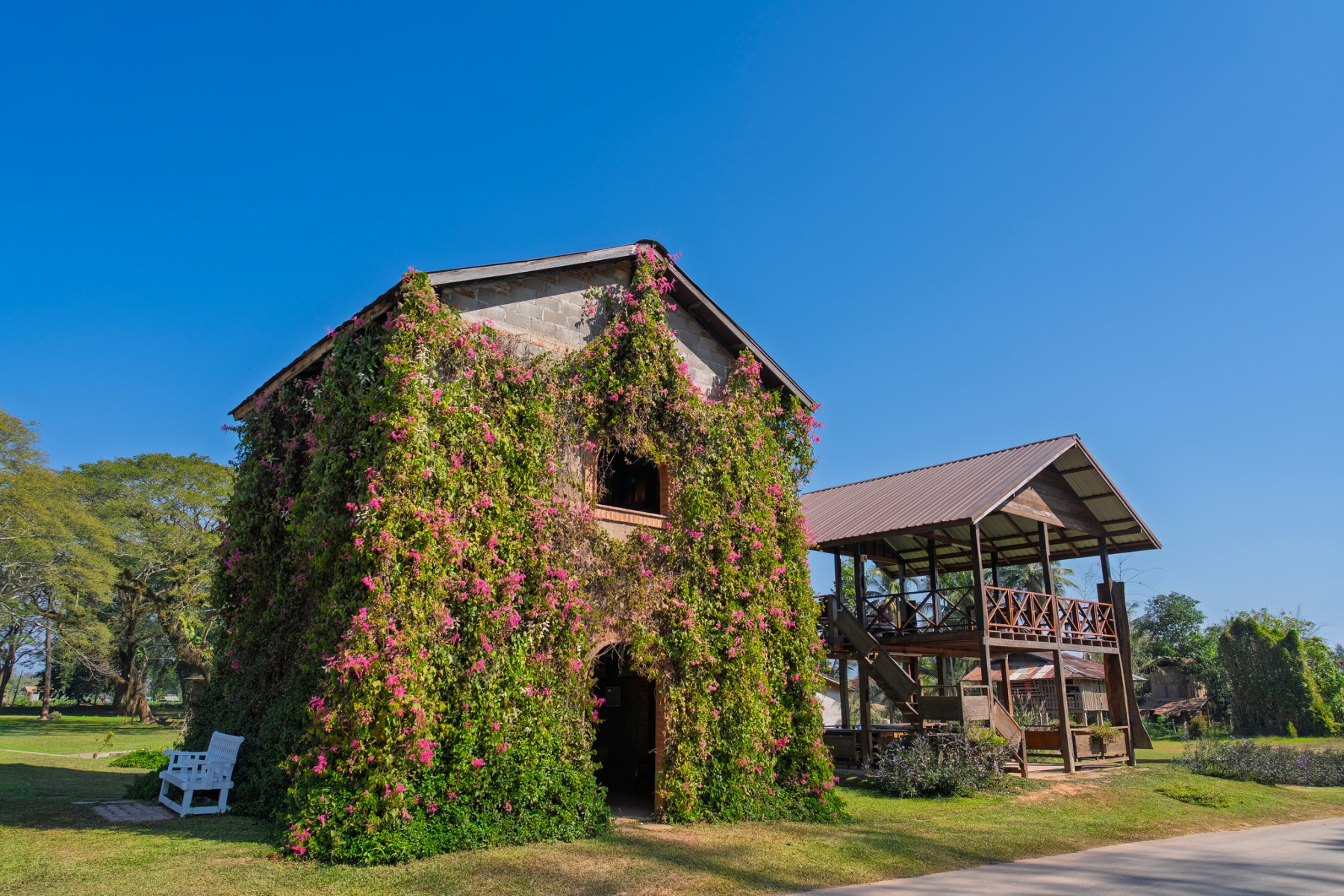 โรงบ่มอิฐแดงหลังเก่าถูกชุบชีวิตใหม่อย่างงดงาม กลายเป็นพื้นที่ศิลปะกึ่งพิพิธภัณฑ์สุดคลาสสิกที่ยังคงกลิ่นอายความแข็งแกร่งของสถาปัตยกรรมดั้งเดิม ✨ ผนังอิฐสีแดงตัดกับสีเขียวสดของพุ่มไม้และต้นจามจุรียักษ์ที่แผ่กิ่งก้านราวกับร่มธรรมชาติขนาดใหญ่ เป็นภาพที่ทั้งอบอุ่นและทรงพลังในเวลาเดียวกัน