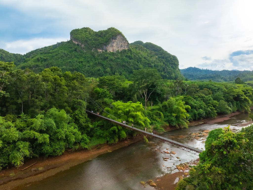 สะพานแขวนเขาพัง สุราษฎร์ธานี ชมภูเขารูปหัวใจกลางสายหมอกที่บ้านตาขุน 💚🏞️ เมื่อยืนอยู่บนสะพานแขวนเล็ก ๆ กลางชุมชนเขาพัง แล้วเงยหน้ามองไปยังขุนเขาเบื้องหน้า คุณจะเห็นภาพที่ทำให้หัวใจเต้นช้าลงอย่างไม่รู้ตัว… ภูเขาลูกหนึ่งที่มีรูปทรงคล้าย “หัวใจ” โอบล้อมด้วยผืนน้ำและผืนป่าเขียวชอุ่ม ราวกับธรรมชาติกำลังบอกเราว่า ความรักและความสงบงามยังคงมีอยู่เสมอ 💚✨