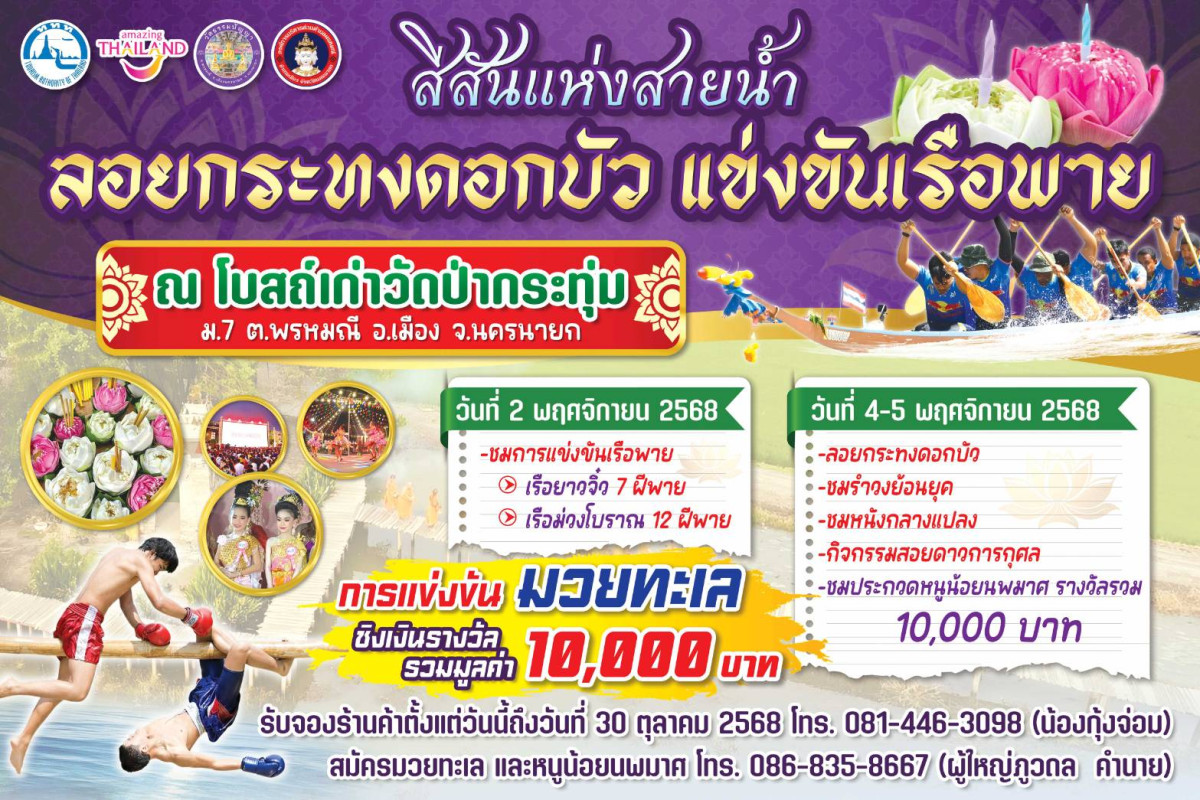 ThailandTravel | 4 Nov - 5 Nov 2025 เวลา 16:00 - 22:00 | 21 | ประเพณีไทยเดือนพฤศจิกายน ลอยกระทงนครนายก เที่ยววัดป่ากระทุ่ม ลอยกระทงดอกบัว สีสันแห่งสายน้ำ ประเพณีลอยกระทงโบราณ งานลอยกระทงภาคตะวันออก ที่เที่ยวหน้าหนาวนครนายก ตลาดโบราณย้อนยุค หนูน้อยนพมาศนครนายก โบสถ์กลางน้ำวัดป่ากระทุ่ม เทศกาลไทยนครนายก กิจกรรมลอยกระทง2568 เที่ยวงานวัดไทย Loy Krathong Nakhon Nayok Wat Pa Krathum Nakhon Nayok Loy Krathong River Festival Thai Cultural Event November Family Travel Thailand Colors of the River Festival Floating Temple Nakhon Nayok Things to do in Nakhon Nayok Thai River Festival 2025 Retro Thai Market Noppamas Pageant Thailand Sea Boxing Nakhon Nayok Thai Lantern Festival Travel Floating Lotus Ceremony Thai Culture Travel Guide Festivals in Eastern Thailand Local Thai Traditions 2025 Visit Nakhon Nayok Thailand