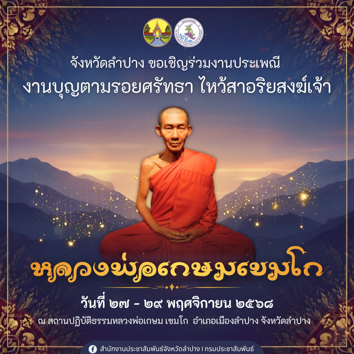 ร่วมงาน “ตามรอยศรัทธา ไหว้สาหลวงพ่อเกษม เขมโก” งานบุญใหญ่ประจำปีลำปาง 27–29 พ.ย. 2568 ดูรายละเอียดเพิ่มเติมได้ที่ https://www.thailandtravel.app