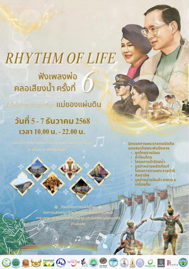 เสียงดนตรีบรรเลงคลอไปกับเสียงน้ำจากเขื่อนขุนด่านปราการชล 🌊 สายลมเย็นพัดผ่านต้นไม้ใหญ่และแสงไฟระยิบระยับทั่วสวน สร้างบรรยากาศอบอุ่นและงดงามในยามค่ำคืน “งานฟังเพลงพ่อ คลอเสียงน้ำ – Rhythm of Life ครั้งที่ 6” คือเทศกาลดนตรีและวัฒนธรรมที่มากกว่าความบันเทิง เพราะนี่คือการรำลึกถึงพระมหากรุณาธิคุณของในหลวงรัชกาลที่ 9 และสมเด็จพระพันปีหลวง ที่ทรงเป็นแรงบันดาลใจให้คนไทยทุกคนเดินหน้าด้วยหัวใจแห่งความพอเพียงและงดงาม 🎺💛