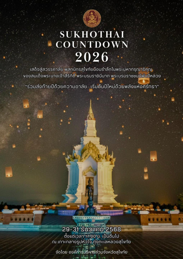 งาน Sukhothai Countdown จัดขึ้นเป็นประจำทุกปีเพื่อเฉลิมฉลองปีใหม่ในบรรยากาศล้านนา–สุโขทัยอันเป็นเอกลักษณ์ เมืองสุโขทัยเป็นดินแดนที่ได้ชื่อว่าเป็น “รุ่งอรุณแห่งความสุข” และการนับถอยหลังท่ามกลางธรรมชาติและแผ่นดินรูปหัวใจ จึงเต็มไปด้วยสัญลักษณ์ของการเริ่มต้นสิ่งใหม่ที่งดงาม 💖🌙