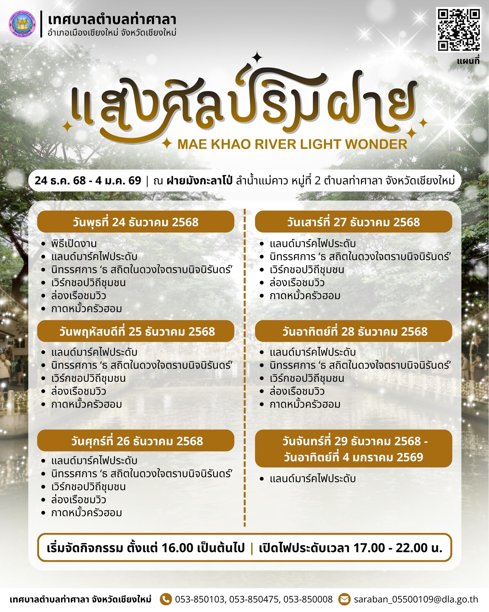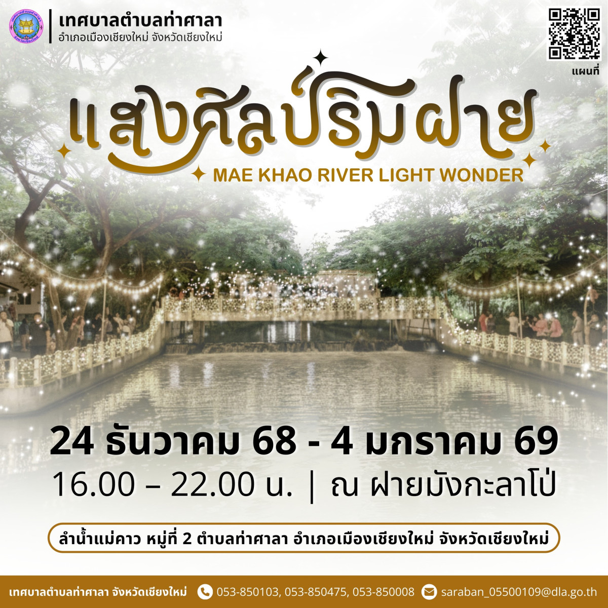 เทศกาลไฟประดับเพื่อส่งเสริมการท่องเที่ยวท้องถิ่น “แสงศิลป์ริมฝาย Mae Khao River Light Wonder” คือเทศกาลที่ทำให้พื้นที่ริมลำน้ำเงียบสงบแห่งนี้ กลายเป็นเวทีแห่งงานศิลปะและแสงสี ที่ถ่ายทอดชีวิต วิถีชุมชน และความงดงามทางธรรมชาติออกมาอย่างมีเสน่ห์จนอยากให้ใคร ๆ ได้มาเห็นด้วยตาตนเอง 🤍✨