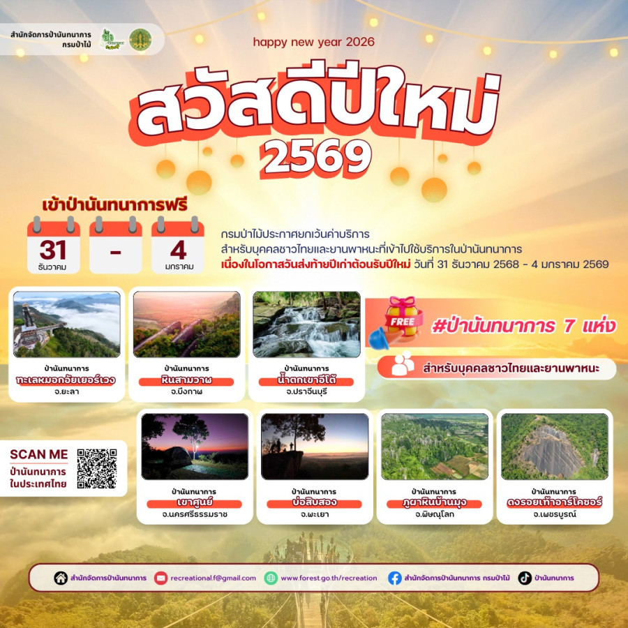 ปลายปีคือช่วงเวลาที่หลายคนอยากพักใจจากความเร่งรีบของทั้งปี ฉันเลือกเก็บกระเป๋าเบาๆ แล้วมุ่งหน้าเข้าสู่พื้นที่สีเขียว เสียงลมพัดผ่านยอดไม้ กลิ่นดินชื้นหลังฝน และอากาศเย็นยามเช้าที่หายใจได้เต็มปอด 🌲✨ ปีนี้พิเศษกว่าทุกปี เมื่อ กรมป่าไม้ ชวนคนไทยออกไปใช้เวลาคุณภาพในป่านันทนาการ “เข้าฟรี” ส่งท้ายปีเก่า ต้อนรับปีใหม่ เติมพลังให้ชีวิต พร้อมเรียนรู้การอยู่ร่วมกับป่าอย่างอ่อนโยน 💚