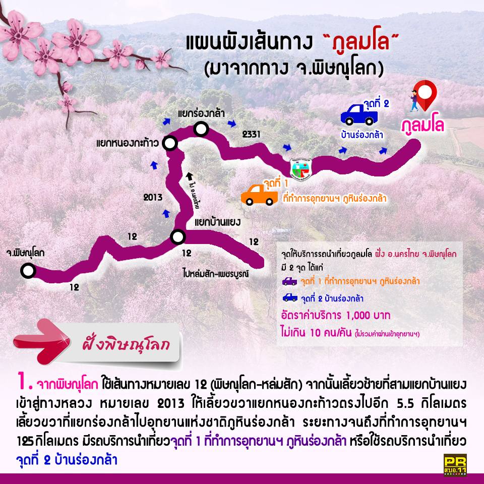 การเดินทางขึ้นภูลมโลจำเป็นต้องใช้บริการรถนำเที่ยวของชุมชนเท่านั้น 🚍 เพื่อควบคุมจำนวนนักท่องเที่ยวและลดผลกระทบต่อระบบนิเวศ อุทยานฯ ไม่อนุญาตให้นำรถยนต์ส่วนบุคคลขึ้นพื้นที่ โดยมีจุดให้บริการจากทั้งฝั่งพิษณุโลก เพชรบูรณ์ และเลย รถให้บริการตั้งแต่เวลา 05.00–16.00 น. นักท่องเที่ยวควรติดต่อจองล่วงหน้า โดยเฉพาะช่วงเทศกาล