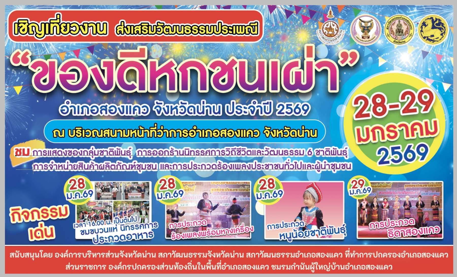 งานส่งเสริมวัฒนธรรมประเพณี “ของดีหกชนเผ่า” จัดขึ้นเพื่อถ่ายทอดและอนุรักษ์วิถีชีวิตของกลุ่มชาติพันธุ์ที่อาศัยอยู่ในอำเภอสองแคว จังหวัดน่าน 🧡