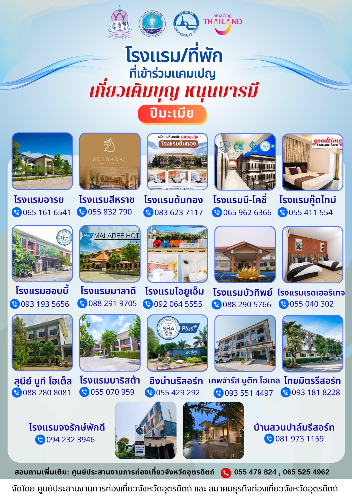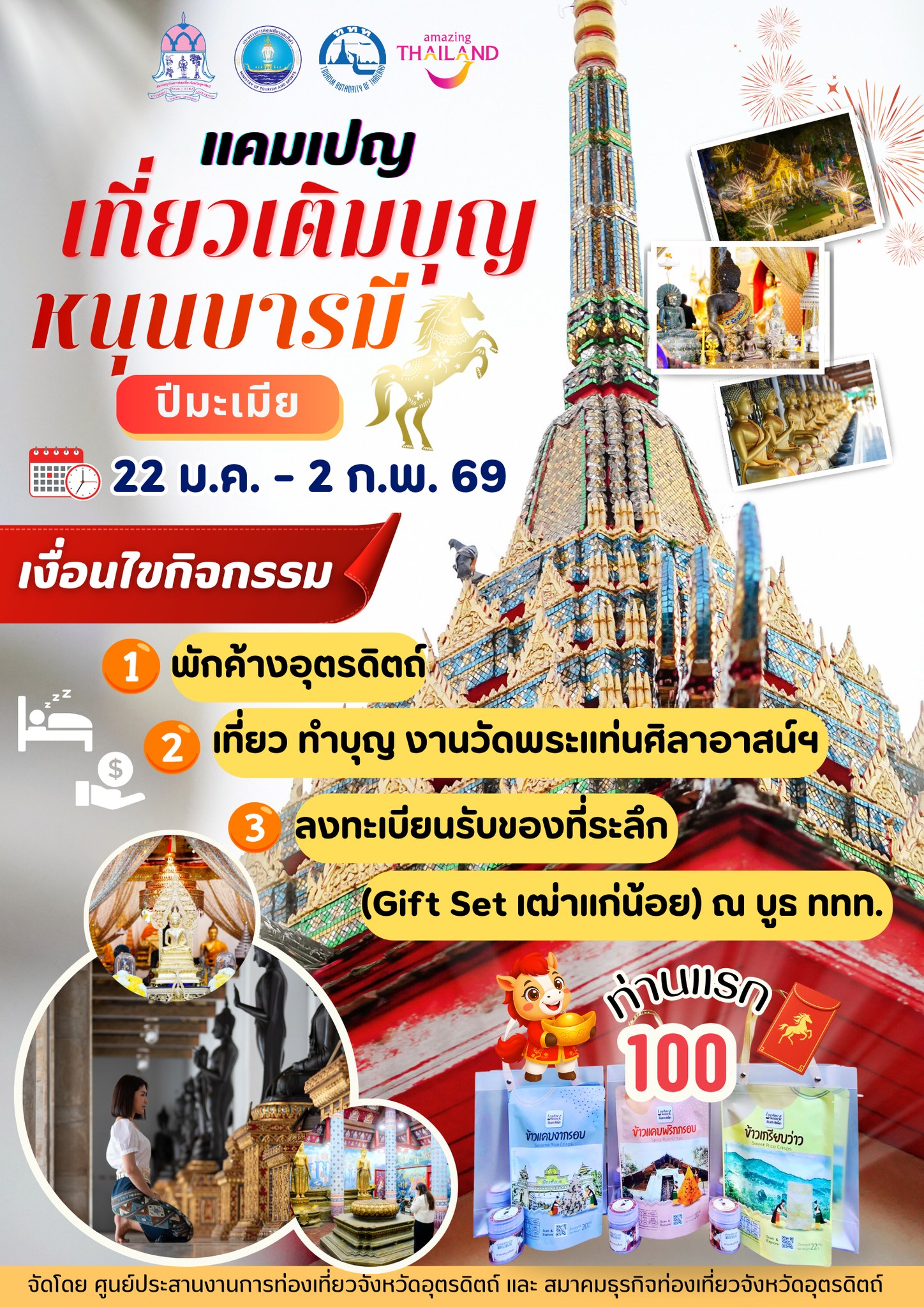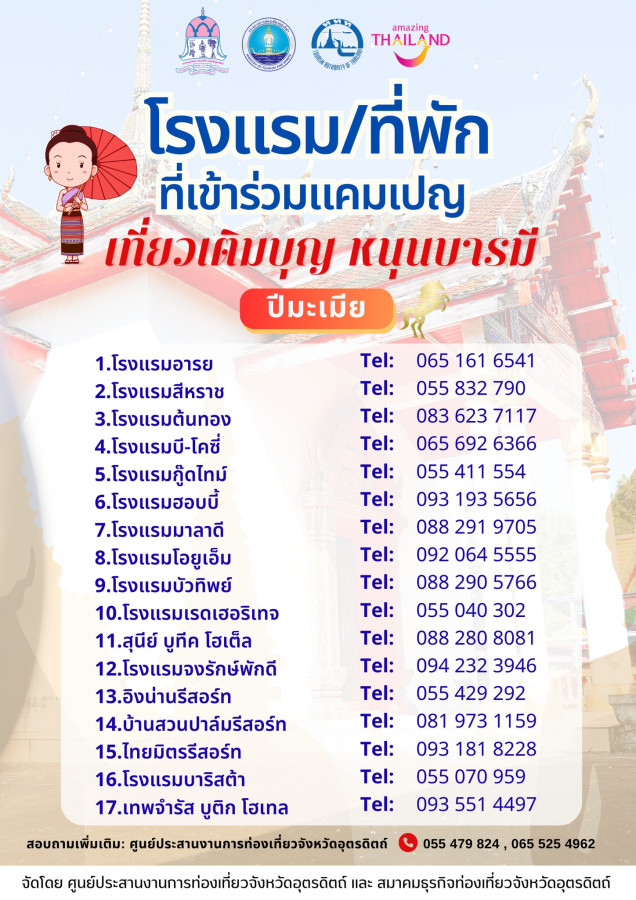 พิเศษยิ่งขึ้นกับแคมเปญ “เที่ยวเติมบุญ หนุนบารมี ปีมะเมีย” ที่จัดโดย การท่องเที่ยวแห่งประเทศไทย ศูนย์ประสานงานการท่องเที่ยวจังหวัดอุตรดิตถ์ ร่วมกับสมาคมธุรกิจท่องเที่ยวจังหวัดอุตรดิตถ์ 🎁