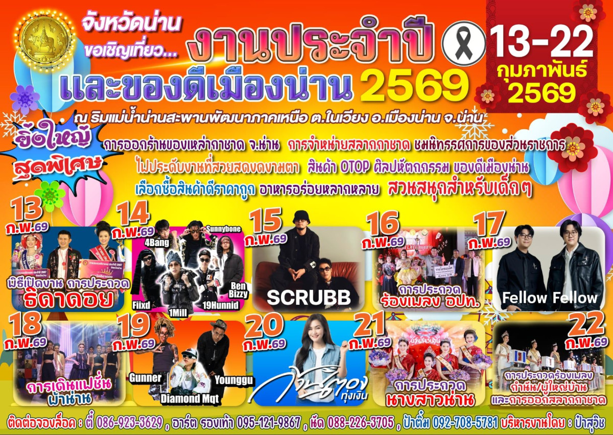 เมื่อสายลมเย็นของเดือนกุมภาพันธ์พัดผ่าน เมืองน่านจะค่อยๆ เปลี่ยนบรรยากาศให้มีชีวิตชีวาเป็นพิเศษ ริมแม่น้ำน่านที่เงียบสงบในวันธรรมดา ถูกแต่งแต้มด้วยแสงไฟ เสียงดนตรี และรอยยิ้มของผู้คนจากทั่วสารทิศ “งานประจำปีและของดีเมืองน่าน ประจำปี 2569” ไม่ได้เป็นเพียงงานเทศกาลประจำจังหวัด แต่คือช่วงเวลาที่วัฒนธรรม วิถีชีวิต และหัวใจของชาวน่าน ถูกถ่ายทอดออกมาอย่างอบอุ่น ให้ผู้มาเยือนได้สัมผัสอย่างใกล้ชิด 🏞️🙏