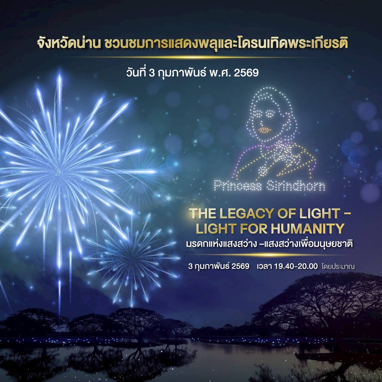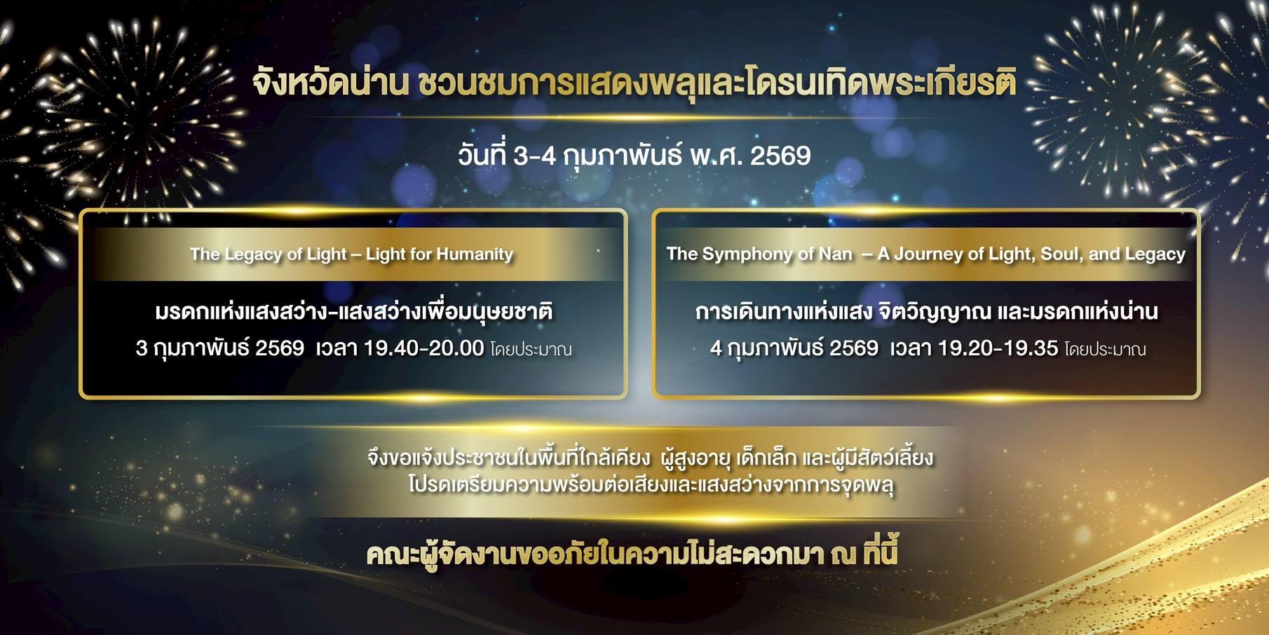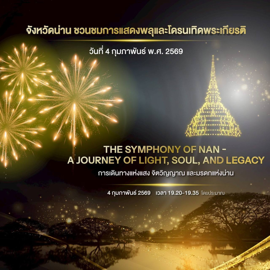 จังหวัดน่านจัดการแสดงพลุและโดรนเทิดพระเกียรติ ระหว่างวันที่ 3–4 กุมภาพันธ์ พ.ศ. 2569 เพื่อเฉลิมพระเกียรติและต้อนรับการเสด็จพระราชดำเนิน ณ จังหวัดน่าน ของสมเด็จพระกนิษฐาธิราชเจ้า กรมสมเด็จพระเทพรัตนราชสุดา ฯ สยามบรมราชกุมารี