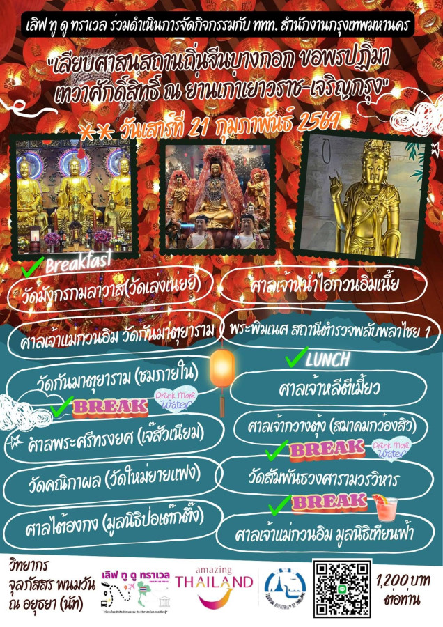 กิจกรรมนี้จัดขึ้นโดย การท่องเที่ยวแห่งประเทศไทย สำนักงานกรุงเทพมหานคร ร่วมกับ Love to do Travel พาเราออกเดินเท้าเลียบย่านชุมชนจีนเก่าแก่ของบางกอก ตั้งแต่ ย่านเยาวราช–เจริญกรุง เพื่อสักการะสิ่งศักดิ์สิทธิ์คู่บ้านคู่เมือง ขอพรด้านการงาน การเงิน ครอบครัว และความรัก พร้อมฟังเรื่องเล่าทางประวัติศาสตร์ที่ซ่อนอยู่ตามศาสนสถานแต่ละแห่ง 🙏