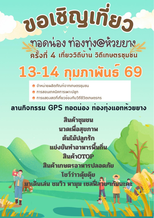 กลางทุ่งนาสีเขียวที่ทอดยาวสุดสายตา ลมเย็นพัดผ่านต้นตาลเรียงราย แสงเย็นยามพระอาทิตย์ตกสะท้อนผืนนาเป็นสีทองอ่อน ๆ บรรยากาศแบบนี้คือสิ่งที่คุณจะได้สัมผัสในงานทอดน่องท่องทุ่ง EP.4 ธีม “Love & Care” ที่จัดขึ้นระหว่างวันที่ 13–14 กุมภาพันธ์ 2569 ณ ทุ่งนาของปันหยา อำเภอทับสะแก จังหวัดประจวบคีรีขันธ์ 🌾✨