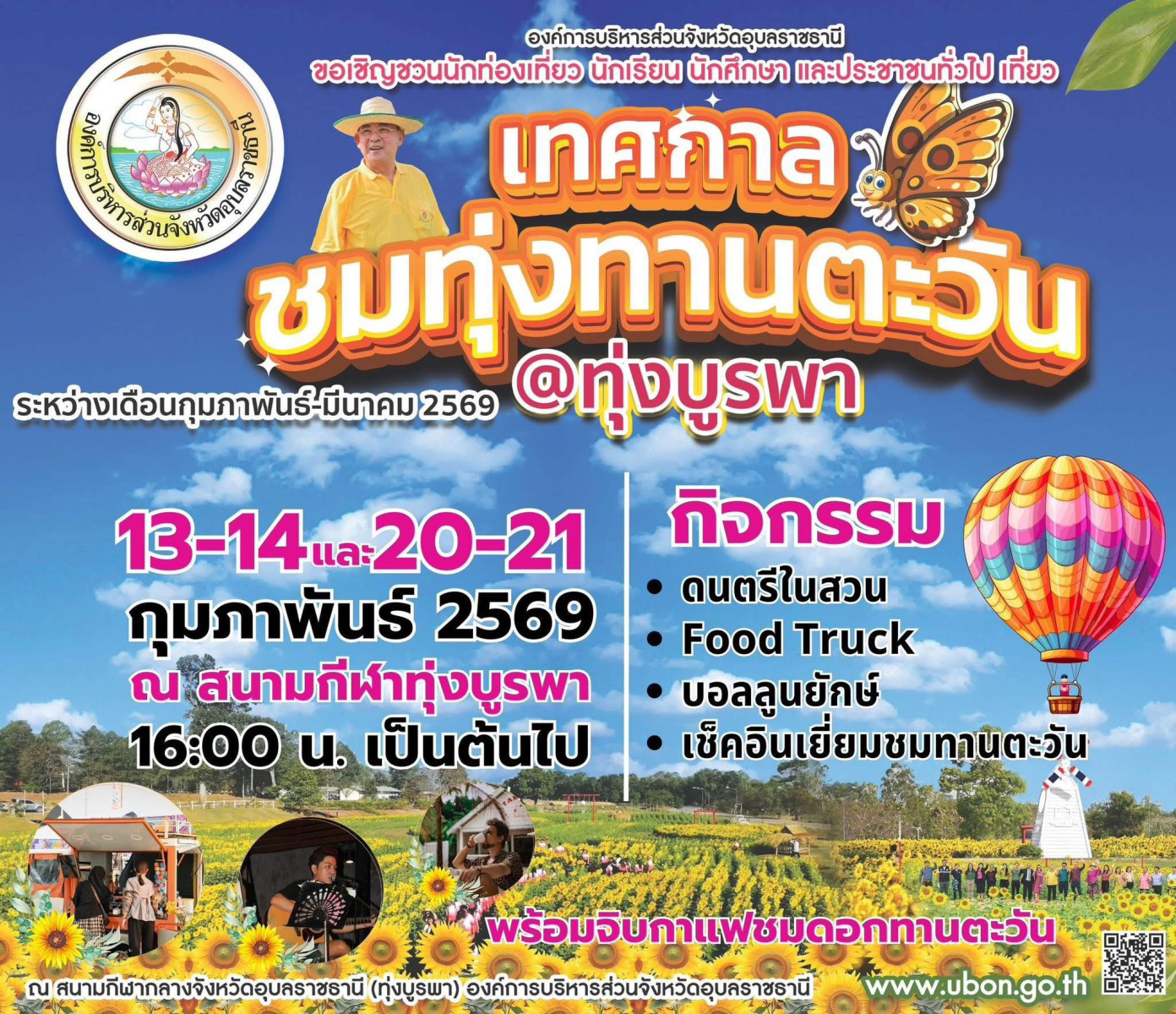 จัดขึ้นระหว่างวันที่ 13–14 กุมภาพันธ์ 2569 และต่อเนื่องในช่วงเย็นวันที่ 20–21 กุมภาพันธ์ 2569 ณ สนามกีฬาทุ่งบูรพา องค์การบริหารส่วนจังหวัดอุบลราชธานี งานนี้ไม่ใช่แค่การชมดอกไม้ แต่คือการสร้างพื้นที่พักผ่อนใจท่ามกลางสีเหลืองสดใสของทุ่งทานตะวันบานสะพรั่ง ✨