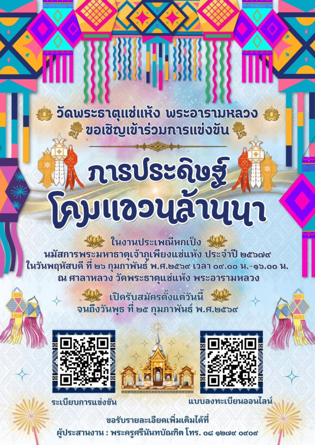 ในโอกาสงานประเพณีหกเป็ง นมัสการพระมหาธาตุเจ้าภูเพียงแช่แห้ง ประจำปี 2569 ณ วัดพระธาตุแช่แห้ง พระอารามหลวง จังหวัดน่าน ได้จัดการแข่งขันการประดิษฐ์โคมแขวนล้านนา (ประเภทบุคคลทั่วไป) เพื่อเปิดพื้นที่ให้ผู้รักงานพุทธศิลป์และหัตถกรรมพื้นบ้าน ได้ร่วมสร้างสรรค์ผลงานถวายเป็นพุทธบูชา และสืบสานอัตลักษณ์ศิลปวัฒนธรรมล้านนาอย่างงดงาม 🙏✨