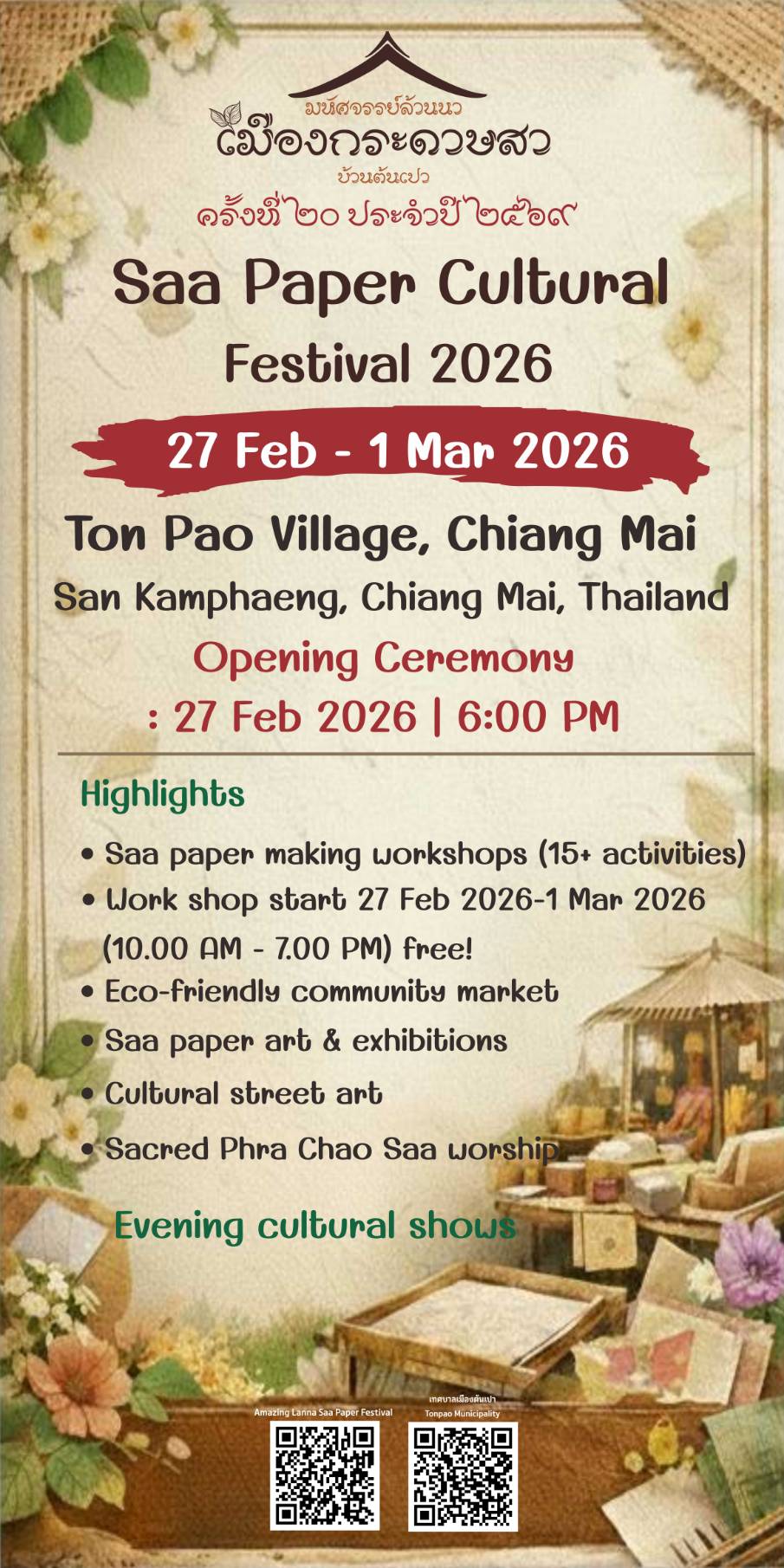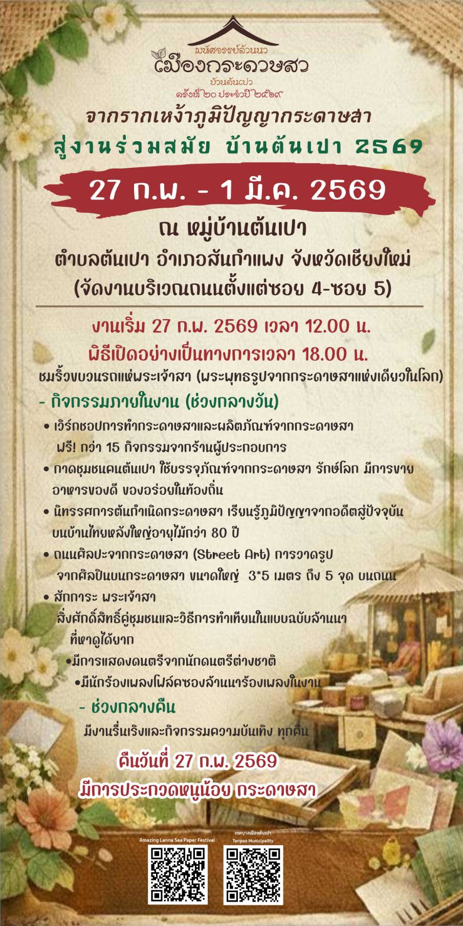 งาน “มหัศจรรย์ล้านนา เมืองกระดาษสาบ้านต้นเปา” จัดขึ้นเป็นครั้งที่ 20 ในปี 2569 เพื่อเฉลิมฉลองรากเหง้าทางวัฒนธรรม พร้อมต่อยอดสู่การออกแบบยุคใหม่ เป็นเวทีให้ชุมชนได้ถ่ายทอดความภาคภูมิใจ และเปิดบ้านต้อนรับนักท่องเที่ยวจากทั่วโลก 🌏