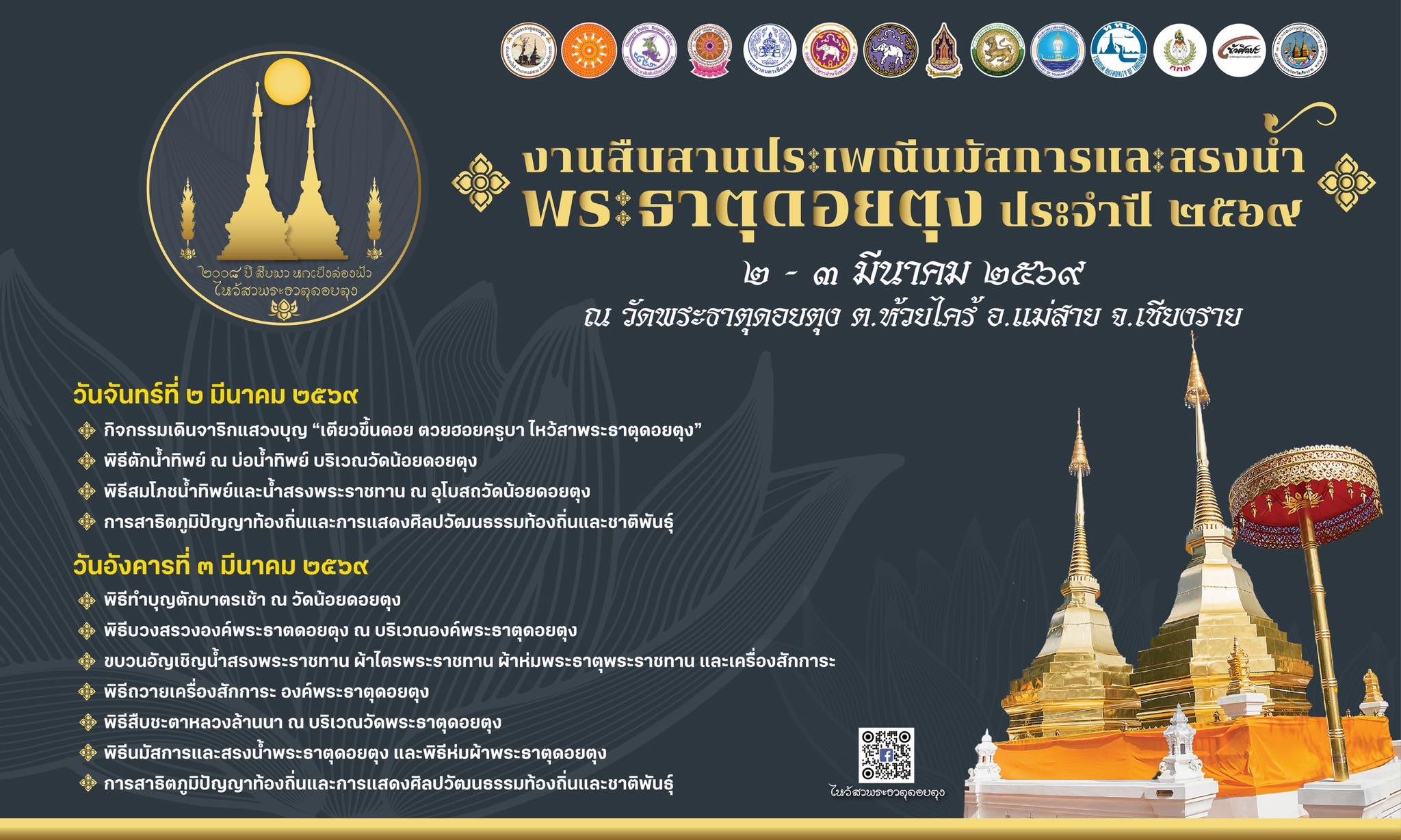 เมื่อสายหมอกยามเช้าลอยคลอเคลียยอดดอย และเสียงระฆังวัดดังกังวานเหนือผืนป่าเขียวขจีของแม่สาย นั่นคือสัญญาณแห่งศรัทธาที่ผู้คนรอคอยตลอดทั้งปี 🌄✨ งานสืบสานประเพณีนมัสการและสรงน้ำพระธาตุดอยตุง ประจำปี 2569 คือช่วงเวลาที่พลังแห่งความเชื่อ ความเลื่อมใส และวัฒนธรรมล้านนาจะถูกร้อยเรียงอย่างงดงามอีกครั้ง