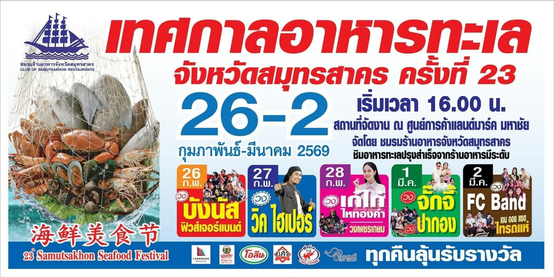 เทศกาลอาหารทะเลจังหวัดสมุทรสาคร ครั้งที่ 23 อิ่มทะเลสด ชมคอนเสิร์ต 5 คืนเต็ม ที่มหาชัย 2569 🌊🦐🎉