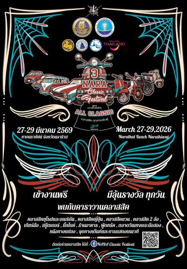 ลองจินตนาการภาพรถคลาสสิคหลากสายพันธุ์จอดเรียงรายริมชายหาด เสียงเครื่องยนต์โทนวินเทจผสมเสียงคลื่นทะเลเบา ๆ และสายลมเย็นยามเย็นของภาคใต้พัดผ่าน 🌊✨ บรรยากาศแบบนี้กำลังจะเกิดขึ้นอีกครั้งในงาน “นราฯคลาสสิคเฟสติวัล ครั้งที่ 3 NARA Classic Festival 3” ระหว่างวันที่ 27 – 29 มีนาคม 2569 ณ หาดนราทัศน์ อำเภอเมือง จังหวัดนราธิวาส เทศกาลที่รวมพลังของชาวคลาสสิคทั่วประเทศ หลังช่วงรายอ ให้ทุกคนได้มาพบปะ พักผ่อน และเฉลิมฉลองความหลงใหลในสไตล์วินเทจไปพร้อมกัน 🎉🏍️