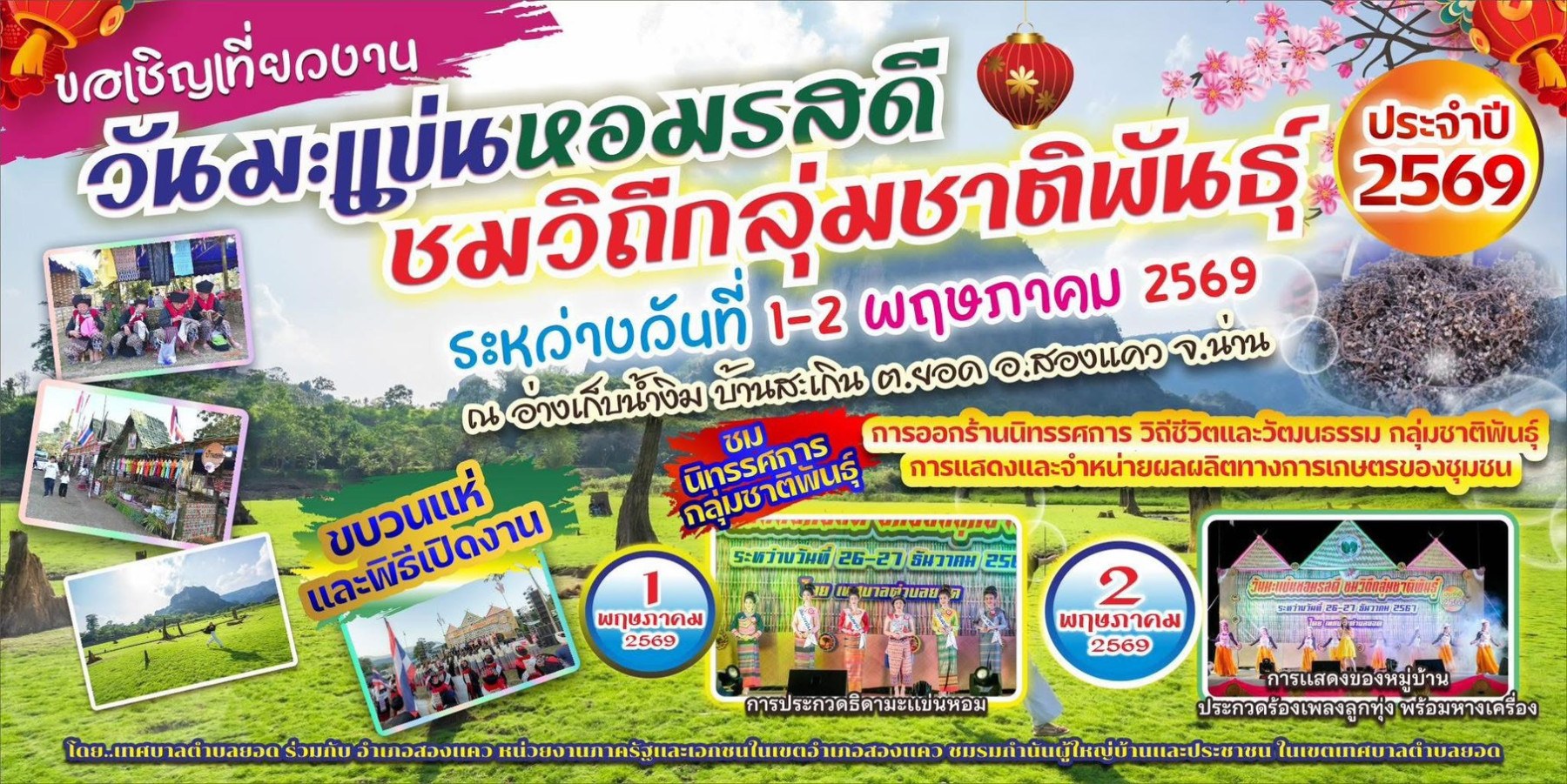 เมื่อสายลมเย็นจากขุนเขาโอบล้อมผืนน้ำเงียบสงบของอ่างน้ำงิม และกลิ่นหอมเฉพาะตัวของ “มะแข่น” ลอยอวลอยู่ในอากาศ… นั่นคือสัญญาณว่าคุณกำลังก้าวเข้าสู่งาน “วันมะแข่นหอมรสดี ชมวิถีกลุ่มชาติพันธุ์” ประจำปี 2569 เทศกาลเล็ก ๆ ที่เต็มไปด้วยเสน่ห์ของธรรมชาติ วิถีชีวิต และความอบอุ่นของผู้คนในพื้นที่บ้านสะเกิน ตำบลยอด อำเภอสองแคว จังหวัดน่าน 🌸