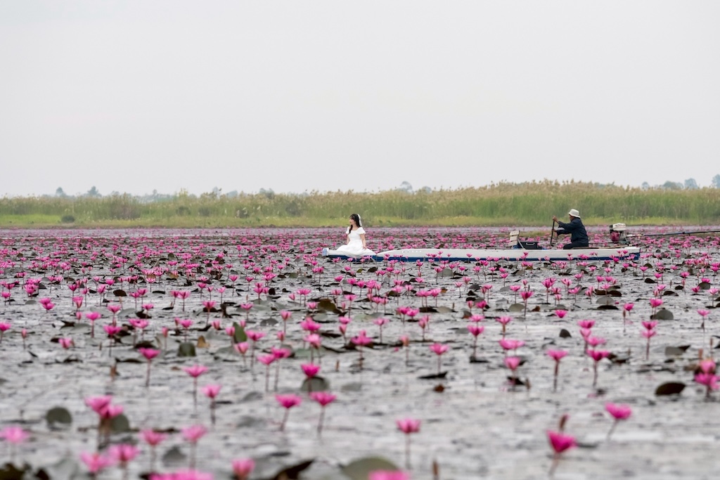เมื่อเรือแล่นผ่านผืนน้ำกว้าง คุณจะได้เห็นดอกบัวแดงบานสะพรั่งทั่วท้องน้ำ สวยจนต้องหยิบกล้องขึ้นมาถ่ายแบบไม่หยุดมือ ไม่ว่าจะเป็นภาพระยะไกลแบบพาโนรามา หรือมุมใกล้ที่เห็นกลีบสีชมพูชัดเต็มตาก็งดงามไม่แพ้กัน