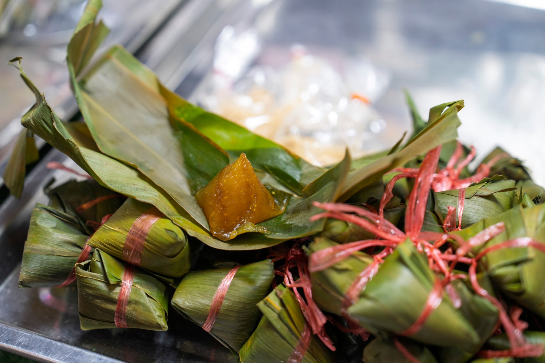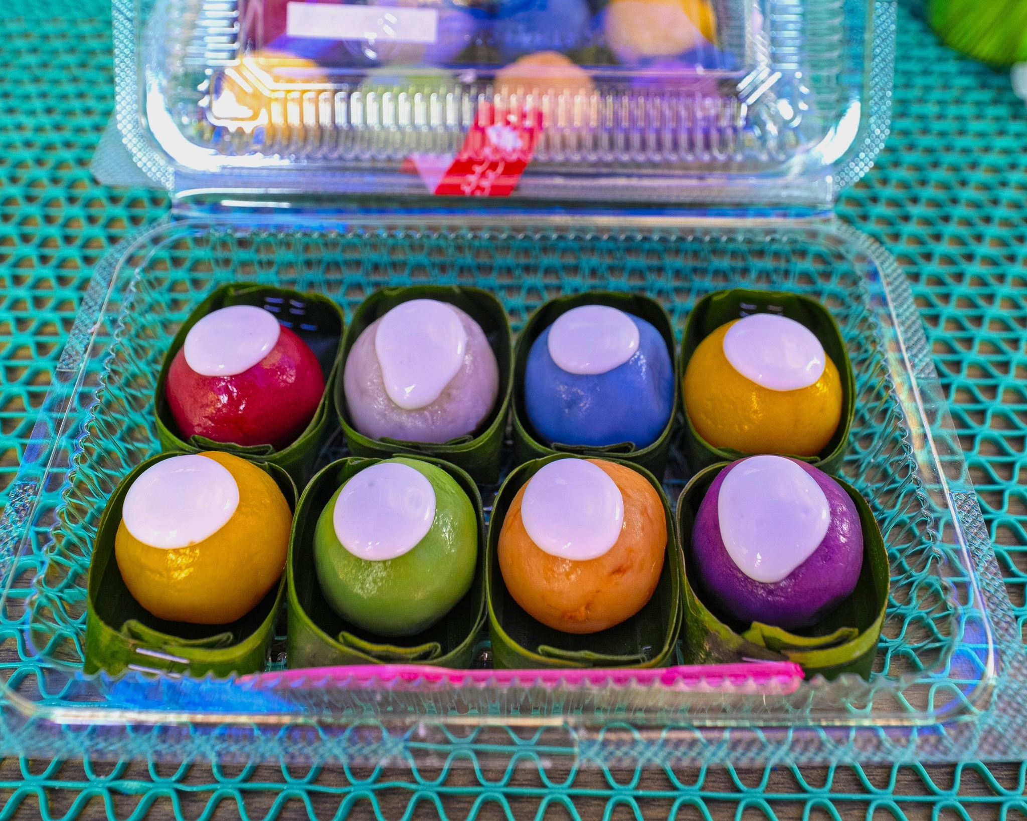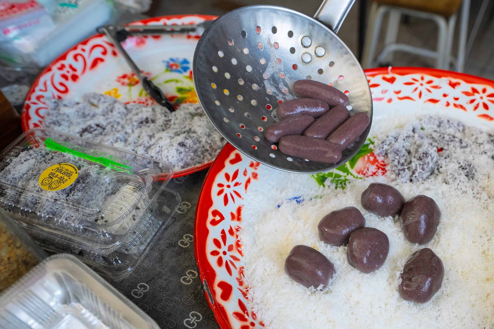 ขนมสีสันสดใสจากสีธรรมชาติ เช่น อัญชัน บีทรูท ฟักทอง ด้านในเป็นไส้ถั่ว ราดด้วยหัวกะทิ หอมมันลงตัว