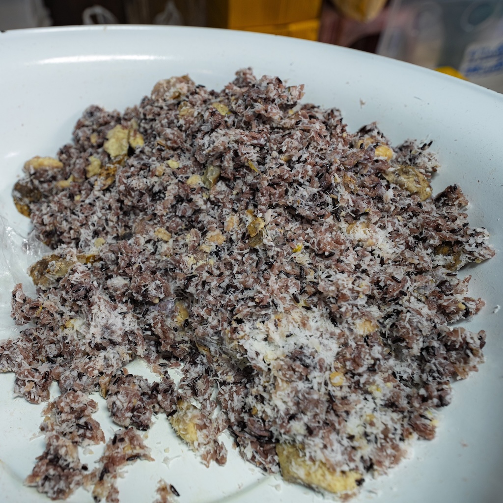 ทำจากแป้งข้าวเหนียวดำ ปั้นเป็นทรงรี คลุกมะพร้าวขูด น้ำตาล และงา เนื้อสัมผัสนุ่มหนึบ หอมหวานกำลังดี