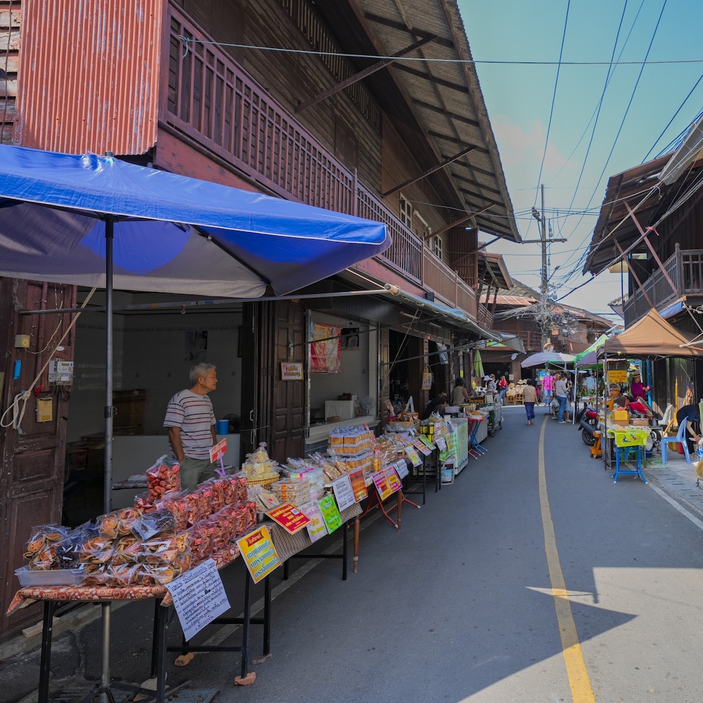 บ้านไม้เก่า ทางเดินเลียบคลอง และร้านขนมเล็ก ๆ เรียงรายกัน ทำให้บรรยากาศโดยรวมเต็มไปด้วยความคลาสสิกและอบอุ่น เหมือนย้อนเวลากลับไปในอดีต 🌿🏡