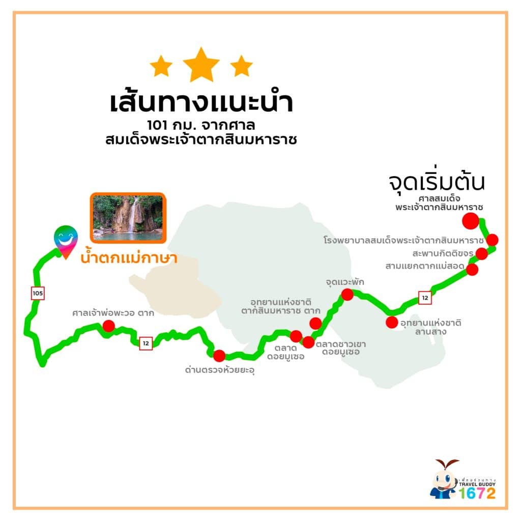 น้ำตกแม่กาษาอยู่ห่างจากศาลสมเด็จพระเจ้าตากสินมหาราชประมาณ 101 กิโลเมตร ใช้เวลาเดินทางจากตัวเมืองตากราว 2–2.5 ชั่วโมง 🚗✨