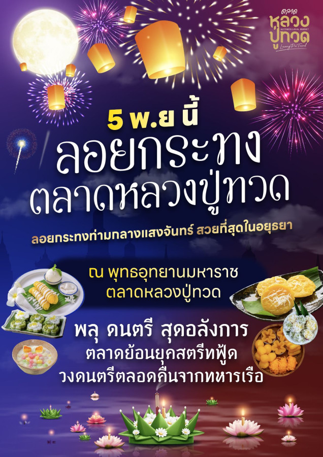 เมื่อถึงเดือนพฤศจิกายนของทุกปี กลิ่นหอมของดอกไม้และแสงเทียนจะลอยไปทั่วเมืองเก่าแห่งอยุธยา และหนึ่งในสถานที่ที่อบอวลไปด้วยมนตร์เสน่ห์แห่งประเพณีไทยแท้ คือ “งานลอยกระทง ตลาดหลวงปู่ทวด” — งานที่ชวนทุกคนมาสัมผัสบรรยากาศไทยโบราณท่ามกลางความอบอุ่นของผู้คนและเสียงหัวเราะยามค่ำคืน 🌺