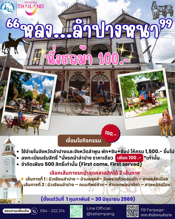 ช่วงต้นปีนี้ การท่องเที่ยวแห่งประเทศไทยชวนเราออกเดินทางอีกครั้ง กับกิจกรรมสุดพิเศษ “หลง…ลำปางหนา” ที่จะพานักท่องเที่ยวมาแอ่วลำปางแบบคลาสสิก ด้วยการ นั่งรถม้าชมเมืองในราคาเดียวเพียง 100 บาท 🎉